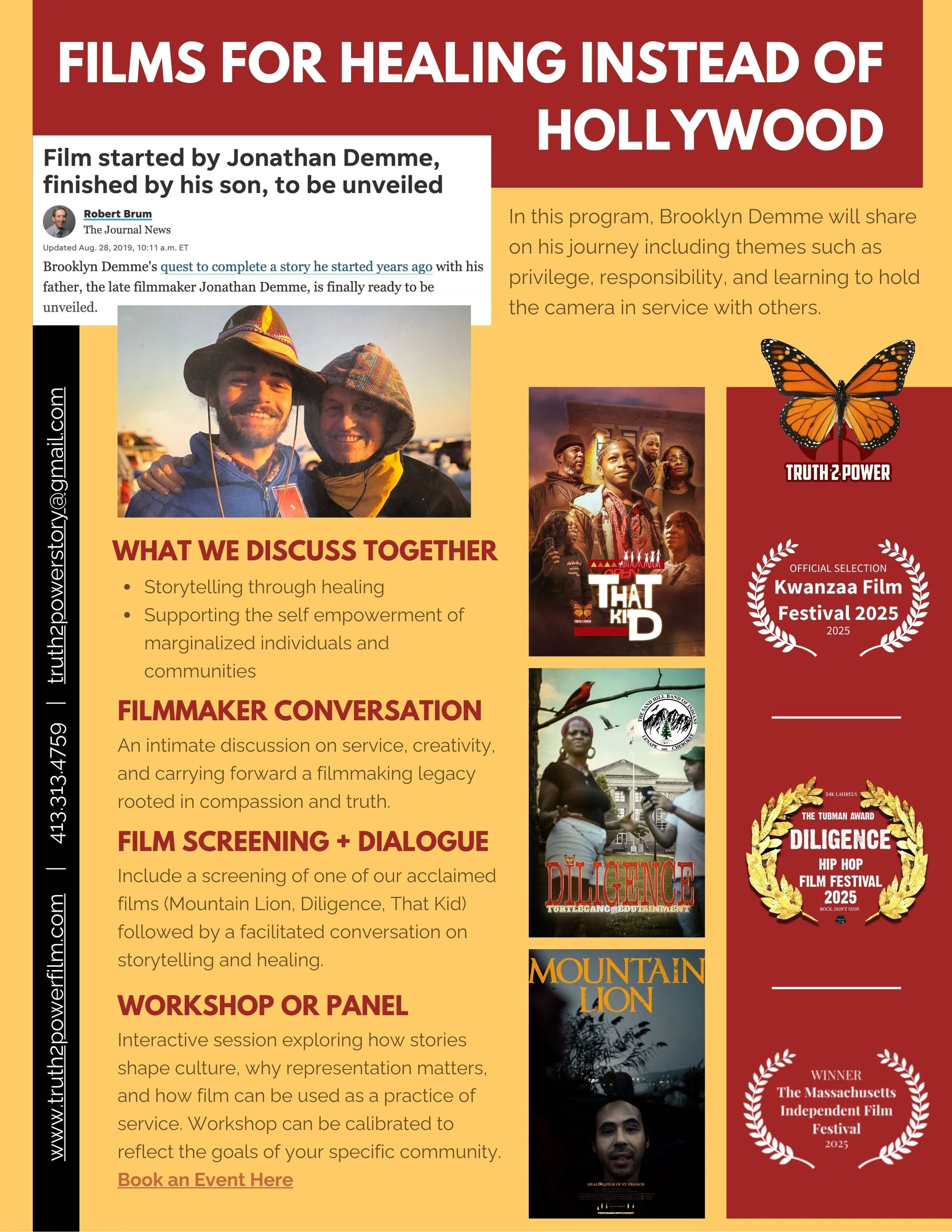 Brooklyn Demme is living his father, Jonathan Demme’s, legacy through a path of service. This program is an opportunity for individuals and institutions to learn how to hold the camera in service to others while holding intimate themes of privilege and responsibility.